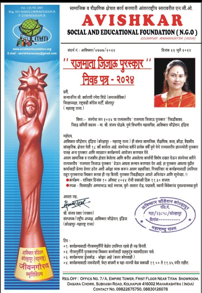 सोलापूर (दै. पंढरी नगरी न्यूज) सोलापूर जिल्हा महिला राष्ट्रवादी काँग्रेस (अजित पवार) गटाच्या अध्यक्ष वर्षाताई शिंदे यांना यंदाचा अविष्कार फौउंडेशन इंडिया कोल्हापूर या संस्थे मार्फत देण्यात येणारा सन-2024 चा राज्यस्तरीय राज्यस्तरीय राजमाता जिजाऊ पुरस्कार नुकताच जाहीर करण्यात आला आहे.