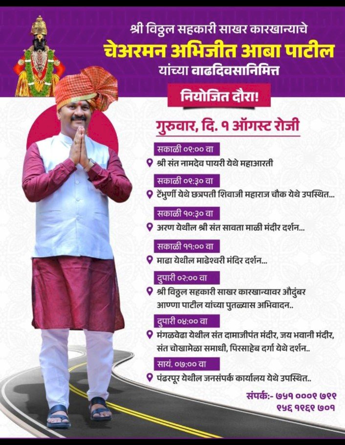 चेअरमन अभिजीत (आबा) पाटील यांनी नेहमीच सर्वांशी आपलेपणाने वागत असल्याने त्यांची क्रेज तरुणांमध्ये मोठ्या प्रमाणात दिसून येत आहे. तसेच भावी आमदार म्हणून ही त्यांच्याकडे सध्या पाहिले जात असली तरी त्यांच्या नेतृत्वावर अनेक जण फिदा झाले असल्याचे पहावयास मिळत आहे. त्यांच्या वाढदिवसानिमित्त पंढरपूर- मंगळवेढा, माढा मतदारसंघात भव्य कुस्ती चे मैदान, भव्य रक्तदान, शिबिर पर्यावरण पूरक व वृक्षारोपण, आरोग्य शिबिर, नेत्र तपासणी अशा विविध कार्यक्रमाचे भरगच्च आयोजन केले आहे. आबांच्या वाढदिवसाच्या निमित्ताने त्यांचा झंजावत दौराही नियोजित करण्यात आला असून गुरुवार दि. 1 ऑगस्ट रोजी सकाळी नऊ वाजता श्री. संत नामदेव पायरी येथे कार्यकर्त्यांच्या समवेत महाआरती करण्यात येणार आहे, सकाळी साडेनऊ वाजता टेंभुर्णी येथे छत्रपती शिवाजी महाराज चौक येथे उपस्थित राहणार आहेत, सकाळी साडेदहा वाजता अरण येथील श्री .संत सावतामाळी मंदिराचे दर्शन व त्या ठिकाणी उपस्थिती, सकाळी अकरा वाजता माढा येथील माढेश्वरी मंदिरदर्शन व उपस्थिती, दुपारी दोन वाजता श्री विठ्ठल सहकारी साखर कारखान्याचे संस्थापक चेअरमन औदुंबर अण्णा पाटील यांच्या पुतळ्यास अभिवादन, दुपारी चार वाजता मंगळवेढा येथील श्री, संत दामाजीपंत मंदिर दर्शन, जय भवानी मंदिर, संत चोखामेळा समाधी, पीर साहेब दर्गा येथे दर्शन व उपस्थिती, त्यानंतर सायंकाळी सात वाजता पंढरपूर येथील जनसंपर्क कार्यालयात अभिजीत (आबा) पाटील प्रेमी कार्यकर्त्याकडून वाढदिवसानिमित्त शुभेच्छा हार सत्कार स्वीकारले जातील वाढदिवसानिमित्त अभिजीत (आबा) पाटील मित्र परिवार उपयोगी कार्यक्रम घेतली असून प्रत्येक कार्यक्रमाला ते उपस्थित राहून जनतेचे प्रेम आणि आदर्श करण्यासाठी आवर्जून उपस्थित राहणार असल्याची माहिती पाटील यांचे स्वीय सहाय्यक नितीन सरडे यांनी दिली.