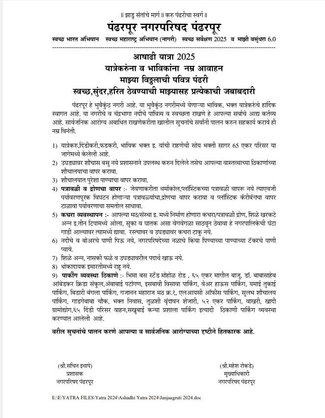 पंढरपूर (दै.पंढरी नगरी न्यूज ):- आषाढी शुद्ध एकादशी ०६ जूलै २०२५ रोजी होणार असून, आषाढी यात्रा कालावधीत पंढरपुरात श्री विठ्ठल- रुक्मिणीच्या दर्शनासाठी परराज्यासह राज्यातील इतर जिल्ह्यातून सुमारे १० ते १२ लाख भाविक येतात. येणाऱ्या भाविकांच्या व स्थानिक नागरिकांच्या आरोग्य सुरक्षितेच्या व स्वच्छतेच्या दृष्टीने आवश्यक सोयी सुविधा उपलब्ध करून देण्यासाठी नगरपालिका प्रशासन सज्ज असल्याची माहिती मुख्याधिकारी महेश रोकडे यांनी दिली.