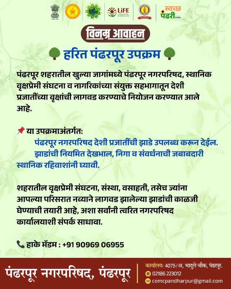 पंढरपूर शहरातील खुल्या जागा मध्ये पंढरपूर नगरपरिषद स्थानिक वृक्षप्रेमी संघटना व नागरिकांच्या संयुक्त सहभागातून देशी प्रजातीच्या वृक्षांची लागवड करण्याची नियोजन करण्यात आले आहे पंढरपूर नगर परिषदेच्या वतीने देशी प्रजातीची जाडी उपलब्ध करून देण्यात येतील झाडांची नियमित देखभाल निगा व संवर्धनाची जबाबदारी शहरातील स्थानिक रहिवाशांनी घ्यावी असे आवाहनही मुख्य अधिकारी रोकडे यांनी केले आहे शहरातील वृक्षप्रेमी संघटना संस्था वसाहती तसेच ज्यांना आपल्या परिसरात नव्याने लागवड झालेल्या झाडांची काळजी घेण्याची तयारी आहे अशा सर्वांनी त्वरित नगर परिषदेच्या कार्यालयातील हाके मॅडम यांच्याशी संपर्क साधावा शहरांमध्ये स्वच्छता स्वच्छतेबाबतच्या सवयी आणि पर्यावरण संरक्षण इत्यादी महत्त्वपूर्ण बाबीची सर्व कार्यपद्धती द्वारे अंमलबजावणी करण्यात येणार आहे. स्वच्छ आणि हरित पंढरपूर करिता सर्व सामाजिक विविध संघटना स्थानीकानी मोठ्या संख्येने सहभागी होण्याचे आवाहन नगरपरिषदेचे मुख्य अधिकारी महेश रोकडे यांनी केले आहे.
