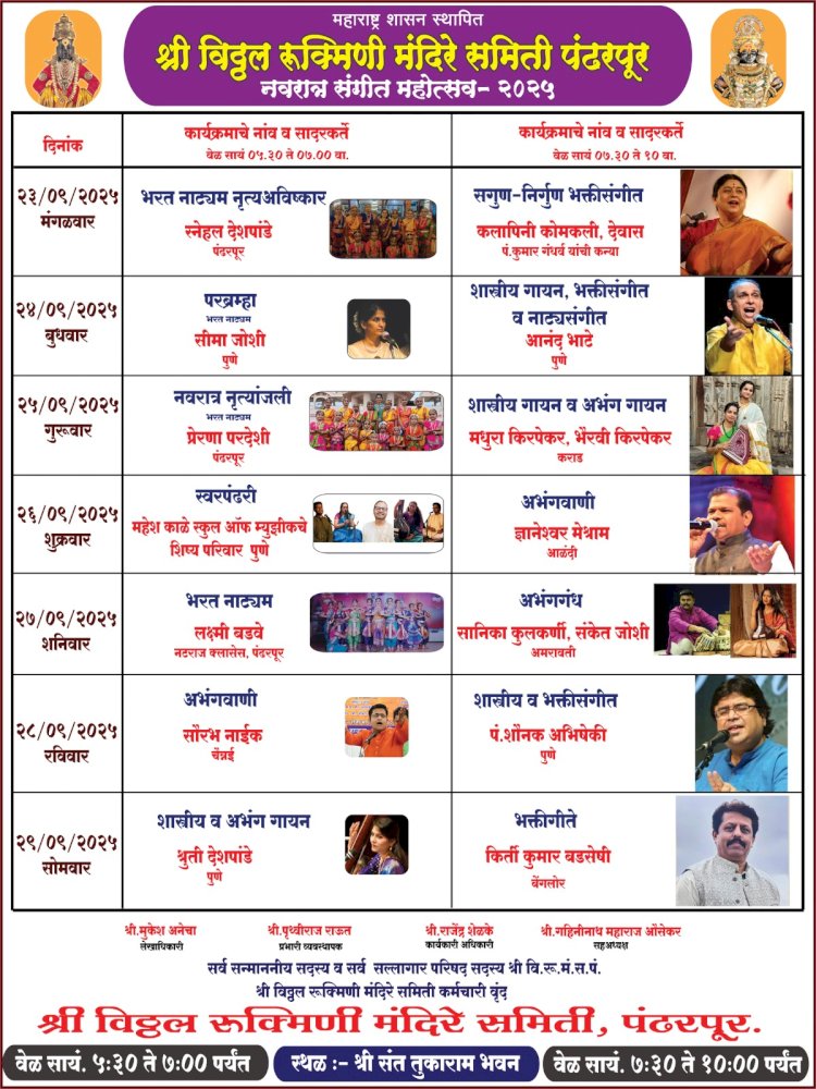 पंढरपूर( दै.पंढरी नगरी न्यूज):- श्री विठ्ठल - रुक्मिणी मंदिरे समिती पंढरपूर यांचे वतीने प्रतिवर्षाप्रमाणे सह अध्यक्ष गहिनीनाथ महाराज औसेकर आणि सन्मा सदस्य यांचे मार्गदर्शनाखाली आणि कार्यकारी अधिकारी राजेंद्र शेळके, प्रभारी व्यवस्थापक पृथ्वीराज राऊत, लेखाधिकारी मुकेश अणेचा यांचे उपस्थितीत दिनांक 23 सप्टेंबर ते 29 सप्टेंबर या कालावधीत 7 दिवस दिग्गज कलाकारांच्या उपस्थितीत श्री संत तुकाराम भवन येथे दुपारी 5.30 ते 7.00 आणि रात्री 7.30 वा. या दोन सत्रांमध्ये श्री रुक्मिणी नवरात्र संगीत महोत्सव साजरा करण्यात येणार आहे.