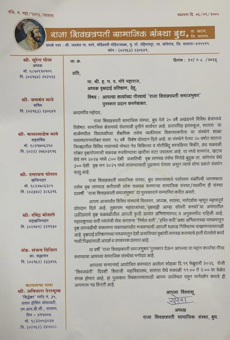 “मोरे महाराज यांनी ‘निर्मल वारी’ व ‘हरित वारी’ यांसारख्या अभियानांच्या माध्यमातून पर्यावरण संवर्धन, समाजप्रबोधन व आध्यात्मिक कार्याचा प्रभावी संगम घडवून समाजासमोर नवा आदर्श निर्माण केला आहे. त्यांच्या या उल्लेखनीय कार्याचा ‘राजा शिवछत्रपती समाजभूषण’ पुरस्काराने झालेला सन्मान ही अभिमानास्पद बाब आहे.”